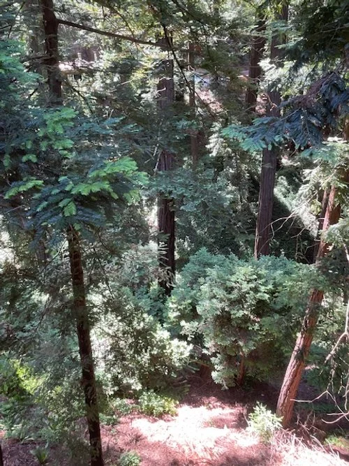 View through the window into the redwood trees.